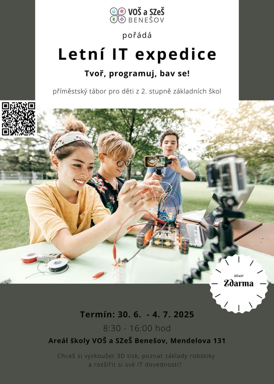 Letní IT expedice: Chceš si vyzkoušet 3D tisk, poznat základy robotiky a rozšířit si své IT dovednosti? Tento tábor je pro tebe jako stvořený! Naučíš se základy programování, práce s moderními technologiemi a zažiješ spoustu zábavy při praktických projektech.