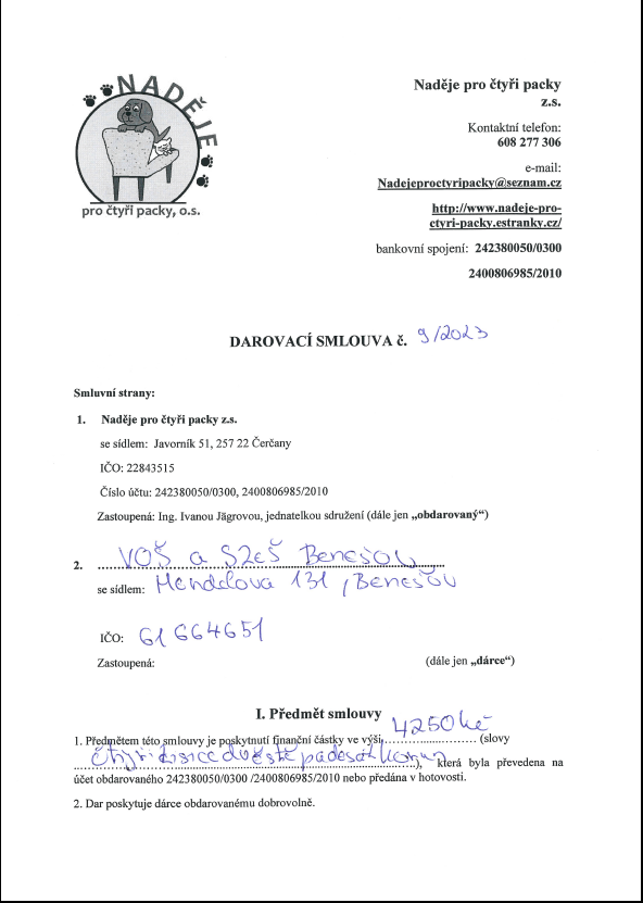 Všem na vědomost dáváme, že dne 16.10.2023 jsme s úspěchem předali výtěžek jarní sbírky pro útulek opuštěných zvířat „Naděje pro 4 packy“ v Opřeticích, paní Ing. Ivaně Jägrové. Ve finanční části sbírky jsme předali 4250,-Kč a v té hmotné to byly dvě krabice a jedna velká a jedna menší taška s dekami, staršími ručníky, hračkami pro pejsky, několika vodítky, kapsičkami s krmivem apod.