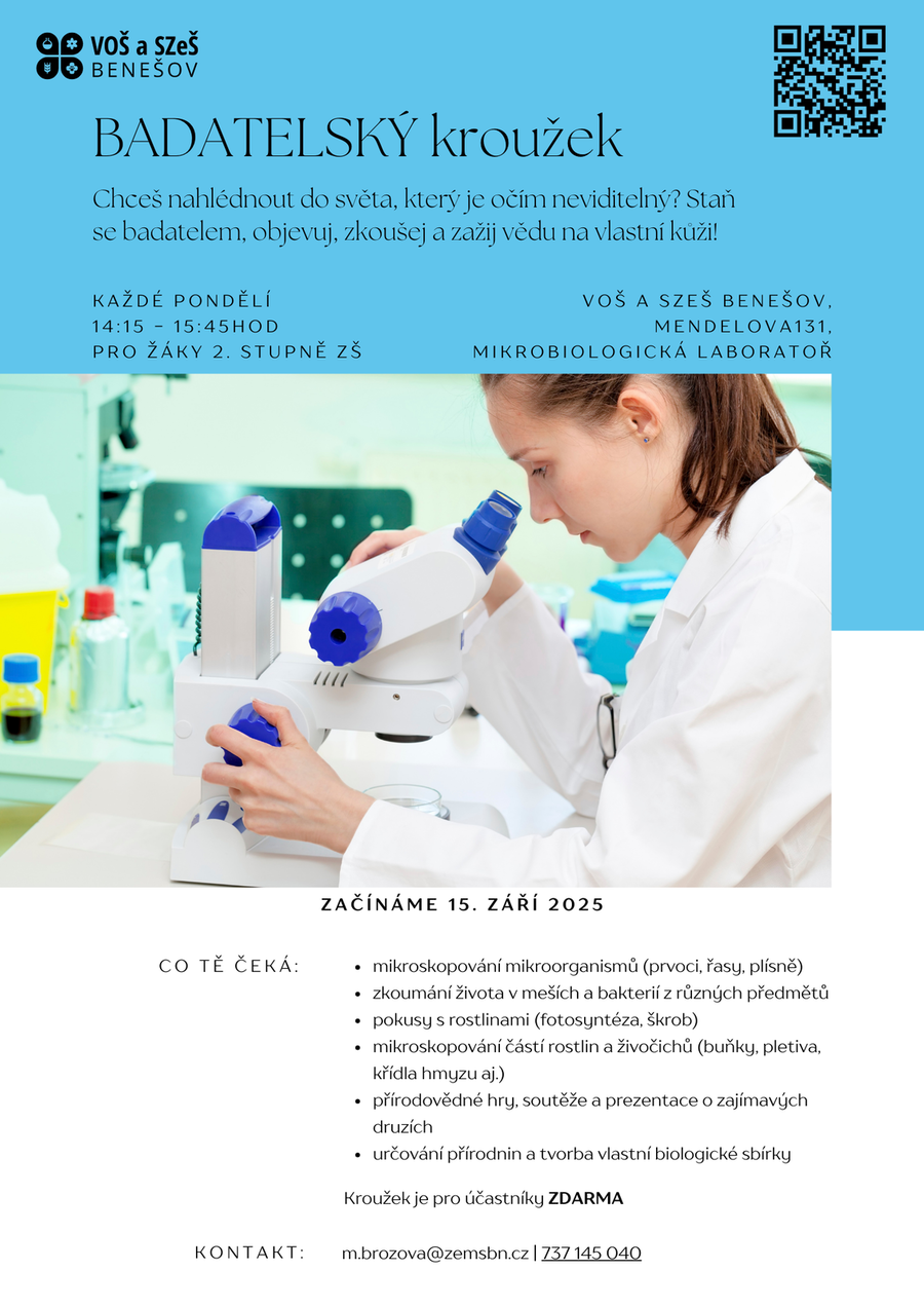 - Badatelský kroužek – mikroskopování, pokusy s rostlinami i živočichy, objevování světa, který je očím neviditelný.