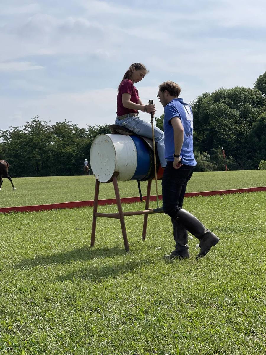 Jízdu na koni v pólu jsme si sice nezkusili, ale vděli jsme živou ukázku tréninku a mohli jsme si na sudovém trenažéru vyzkoušet odpálení míčků maletou.