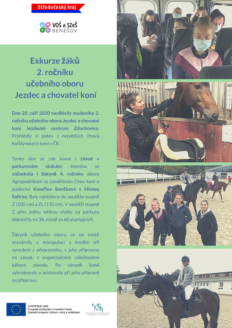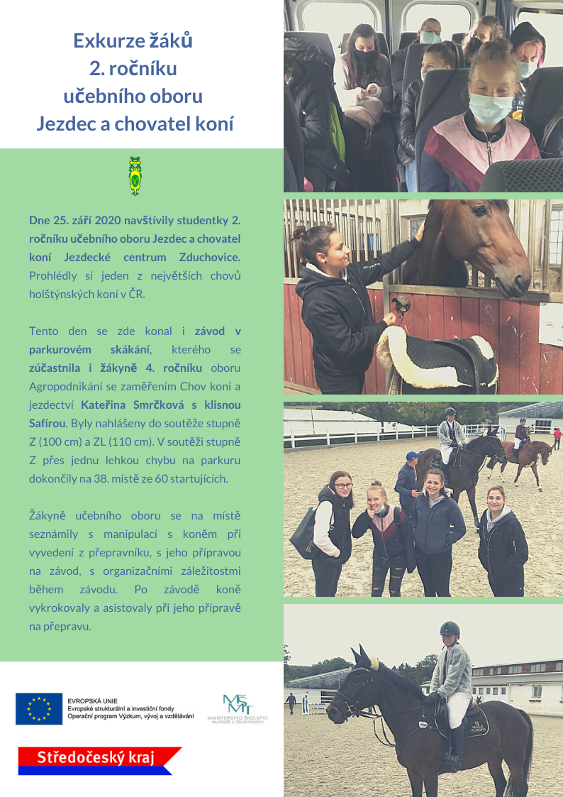 Dne 25. září 2020 navštívily studentky 2. ročníku učebního oboru Jezdec a chovatel koní Jezdecké centrum Zduchovice. Prohlédly si jeden z největších chovů holštýnských koní v ČR.