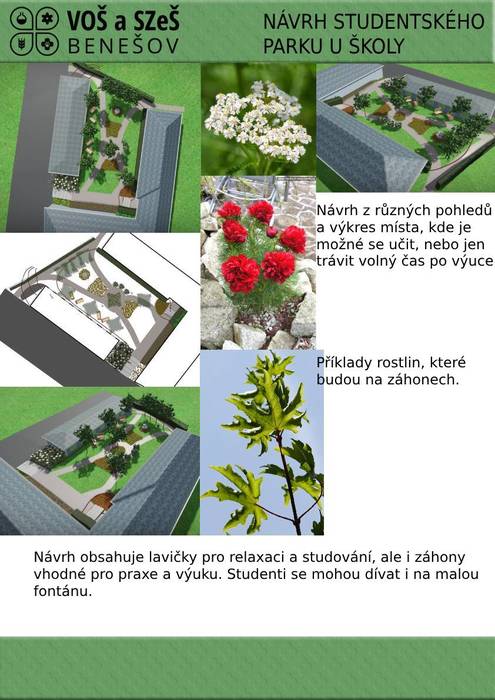 Návrh bude ideální pro všechny studenty i zaměstnance školy. Bude možné zde relaxovat na lavičkách nebo na trávě, ale také zde může probíhat výuka jak v odborných předmětech jako například praxe, tak v ostatních.