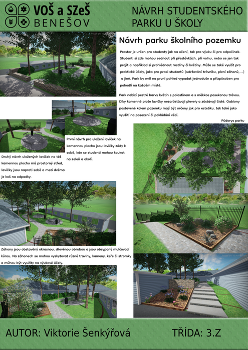 Školní park je vyhrazen jak pro studenty na učení či odpočinek, tak pro učitele a návštěvníky školy.