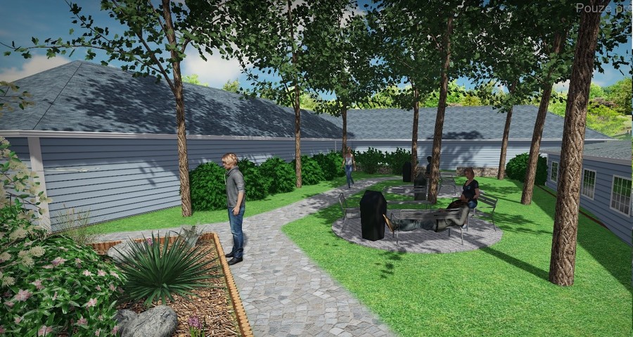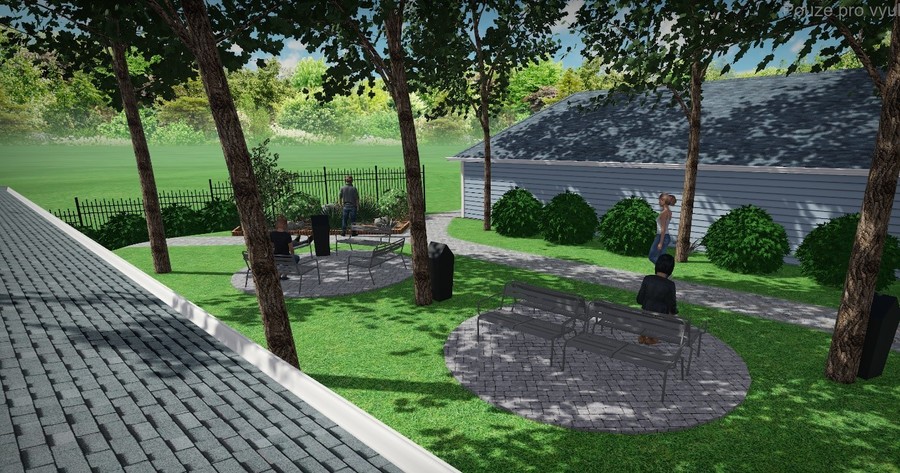 Park nabízí spousty druhů rostlin, lavičky na posezení, odpadkové koše, záhon s rostlinami a stromy.