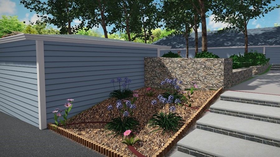 Záhon před školou je obohacen barevnými rostlinami s mulčovací kůrou. Park je obstavěný gabiony a možno využití jako posezení.