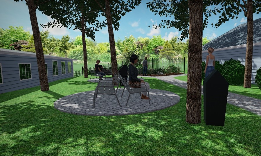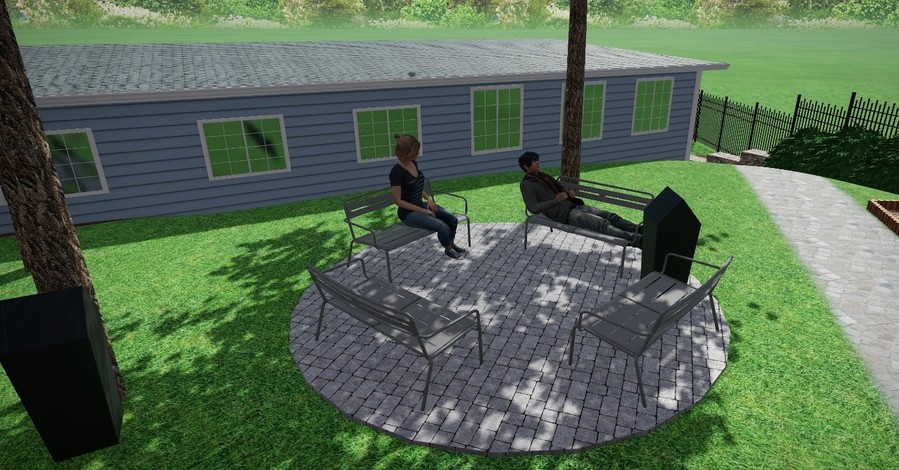 Lavičky jsou kovové a uložené od sebe s výhledem na park. Pod lavičkami jsou zarovnané se zemí kamenné kostky, určené proti plevelu.